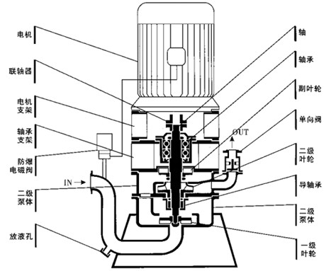 WFB型無密封自控自吸泵主要由泵體、葉輪、泵蓋、導葉、副葉輪、泵軸、連接架、電動空氣控制閥等部分組成。該泵體內(nèi)部由吸入室、儲液室、氣液分離室等部分組成。泵在正常起動后,葉輪將吸入室所存的液體及吸入管路中的空氣一起吸入,液體混合氣體在葉輪高速旋轉(zhuǎn)的離心力作用下經(jīng)導葉拋入氣液分離室,由于流速突然降低,氣體與液體的比重不同,較輕的氣體從混合液中分離出來并被排出泵外,脫氣的液體重新進入工作腔與葉輪內(nèi)部從吸入管路中吸入的空氣再次混合,在葉輪的旋轉(zhuǎn)的作用下,很快使泵體入口形成一定的真空度,從而達到自吸的目的。由于該泵具有獨特的排氣功能,因此該泵能輸送含有氣體的液體并無須安裝底閥。該泵配有“電動空氣控制閥”運行時,控制閥關(guān)閉,實現(xiàn)密封;停機后控制閥打開,破壞了吸入管路中的真空,防止停機后泵腔內(nèi)的液體因缸吸作用而眾吸入管路流出,使泵腔內(nèi)保存足夠的液體來繼續(xù)完成自吸過程,從而實現(xiàn)了“首次引流、自吸”。