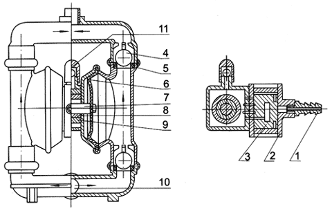 在圖中壓縮空氣由進口進入配氣閥,使膜片向右運動,則A室吸力使介質由C入口流入,推開球閥2進入A室,球閥4則因吸入閉鎖,B室中的介質則被擠壓,推開球閥3由D流出同時使1閉鎖,防止回流,就這樣循環(huán)往復使介質不斷從C入口吸入D出口出排出。