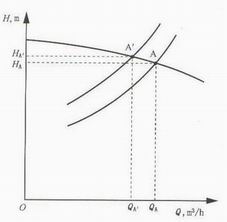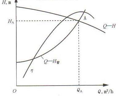 江同以系統(tǒng)中泵的性能曲線與管路性能曲線,用同樣的比例遲會在同一張圖上,則這兩條曲線的交點A稱為系統(tǒng)的工作。如圖6-1所示。A點即在泵的Q—H曲線上,也在管路的 Q—H管曲線上。從泵角度講,QA、HA表示以流量QA通過泵,由泵給液體提供能量是HA;從管路角度講QA、HA表示以流量QA通過管路時,管路所需要的能量是HA。即Q泵+Q管=QA,H泵=H管=HA,所以在A點工作時,工作穩(wěn)定,稱為系統(tǒng)的工作點。