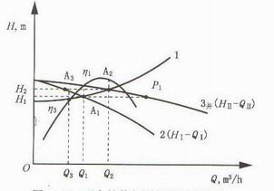 1--管路阻力曲線:2--單臺時揚程曲線:3--兩臺并聯(lián)時揚程曲線