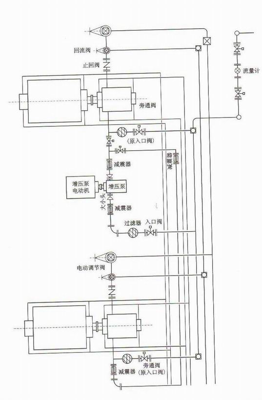 一般工藝流程:由泵站儲水罐來水,經(jīng)過過濾器入口閥、流量計管線、入口減震器(專利產(chǎn)品)、大小頭)、前置增壓泵、大小頭、減震器(專利產(chǎn)品)、管線、閥(有時無)、管線進入注水泵入口,經(jīng)注水泵及其出口、單位向閥、出口閥、經(jīng)管線進入?yún)R管。