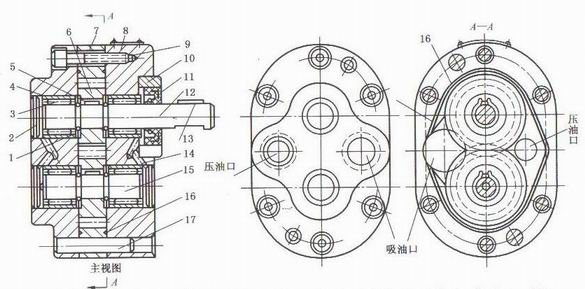 圖3-44和圖3-45分別是外嚙合齒輪泵和內(nèi)嚙合齒輪泵的結(jié)構(gòu)示意圖。