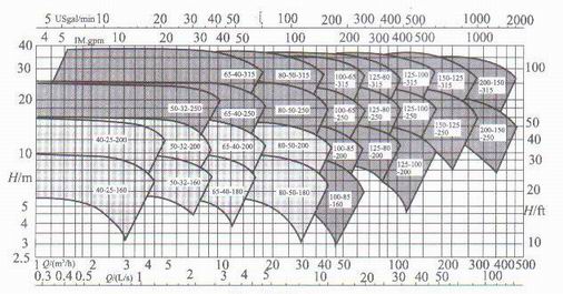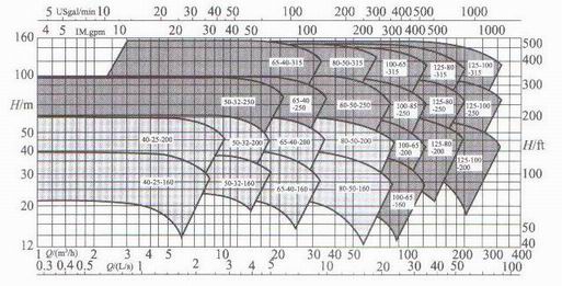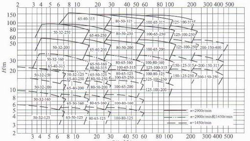 將每種系列泵的*佳工作(性能)范圍繪于一張坐標圖上稱為型譜。為了使形圖協(xié)調,高揚程和大流量時的工作范圍不致過大,通常采用對數坐標表示,一般每種系列泵只有一個型譜。