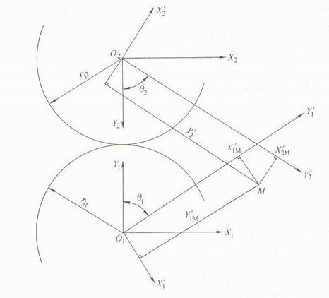 由圖1-10所示:若兩根互相嚙合的螺桿螺旋的節圓半徑分別為r和r 。螺桿1的固定坐標系為X1O1Y1,螺桿1的齒形曲線隨著動坐標系X1O1Y1轉動了O 角:螺桿2的固定坐標系為X2O2Y2轉動了O2角:由于兩相互嚙合的螺桿旋轉時轉向必定相反,故O1和O2 為反向:為便于討論,現將X'1O'1Y'1動坐標系中的任意點M(x'1,y'1)轉換到X1O1Y1固定坐標系,坐標系旋轉了O1角,即得。