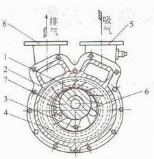 1—葉輪:2—泵體:3—注液孔:4—形成水環(huán)處:5—進氣管:6—吸氣窗口:7—排氣窗口:8—排氣管