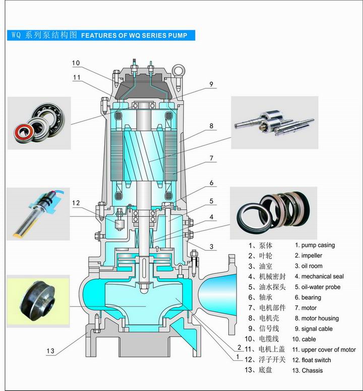 WQP系列不銹鋼潛水排污泵由電機與泵兩部分組成,二者通過油隔離室及機械密封組件隔開,屬機電一體化產(chǎn)品,電機與泵合用同一軸(轉(zhuǎn)子)整個水泵長度短,結(jié)構(gòu)緊湊。配備多種保護裝置,使得泵運行可靠,其主部件作用如下: