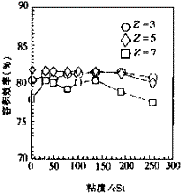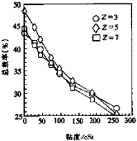 2.3 水力效率 圖6表示不同葉片數條件下水力效率隨粘度的變化關系。當粘度低于200cSt時,Z=5葉輪水力效率比其它葉輪高;當粘度高于200cSt時,Z=3葉輪比其它葉輪高。這種變化趨勢與泵總效率隨粘度的變化情況很一致,見圖9。