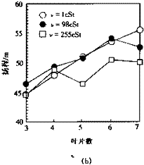 圖3(a)表示在粘度為1cSt(水)、98cSt(油)和255cSt(油)條件下,采用本文方法計算的滑移系數隨葉片數的變化曲線。圖3(b)為實驗測得的工況揚程。由圖可見,滑移系數隨葉片數的變化規律與揚程隨葉片數的變化規律完全一致,再次表明本文計算方法是合理的?傮w上,輸送粘油時滑移系數與葉片數的關系基本還是線性的。