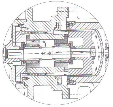 從圖2-3中箭頭所示,可看出潤滑介質由高壓進→葉輪背葉片→高壓出的循環模式,流通順暢,也可解決易汽化介質所產生的氣蝕問題,保證了泵的性能。