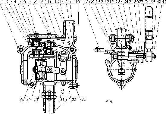 S、SH-25、38型手搖泵的結(jié)構(gòu)原理是,當(dāng)用手往復(fù)搖動搖手柄(29)時,通過軸(21)、搖臂(9)、連桿(36)等傳動機構(gòu),使活塞(7)作往復(fù)運動。如圖所示,當(dāng)活塞向左移動時,右端的泵缸體積逐漸擴大,形成真空,液體從吸水管(34)經(jīng)過鑄在泵體旁邊的吸入流道頂開吸水閥進(jìn)入缸體右端。在同一時間里,缸體左側(cè)由于活塞的壓縮,使壓水閥(5)頂開,液體經(jīng)吐出管(11)排出。若活塞的運動方向返回向右時,則泵缸左側(cè)吸入液體,泵缸右側(cè)排出液體,這樣往復(fù)不歇地把液體吸入排出。形成泵的工作。泵的壓水閥向上行程由蓋板(6)限止,吸水閥向上行程由壓水閥限止。蓋板與泵體用螺栓(8)緊固,活塞行程由泵蓋(14)和泵體限止。